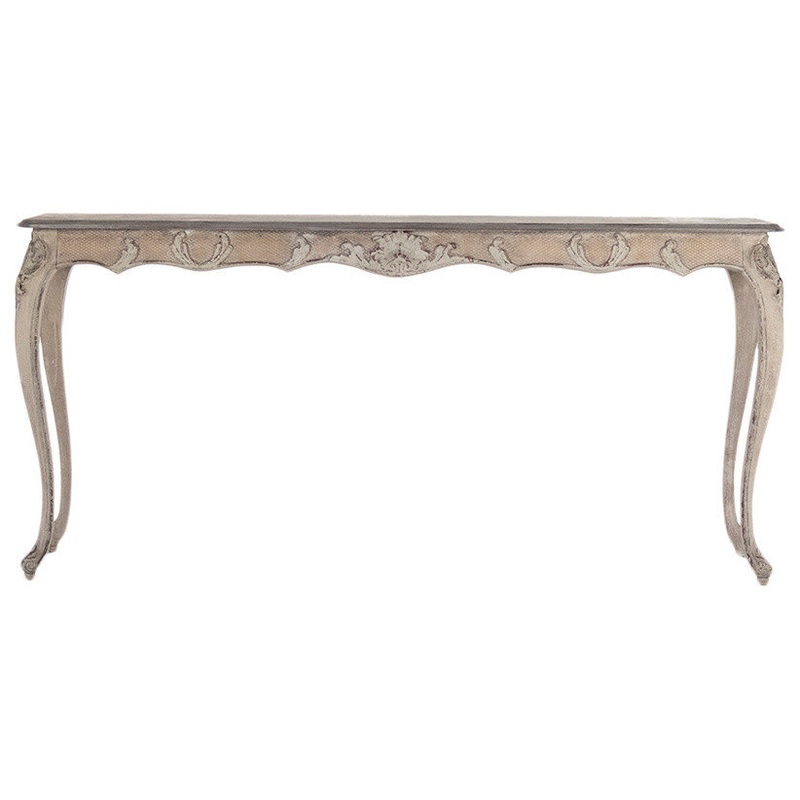 Vintage console with French details on curved legs with grey top and distressed off-white finish.