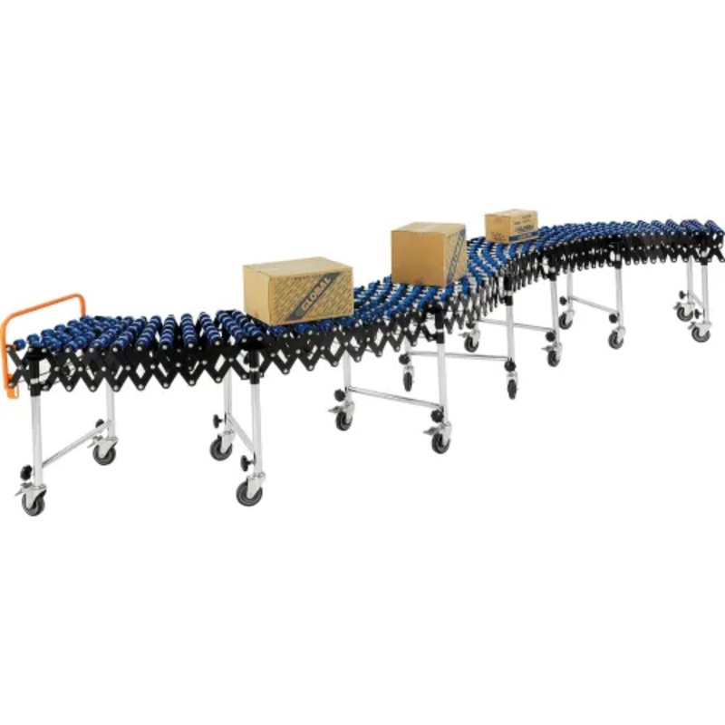 Instantly set up conveyor lines for shipping, receiving, assembly, and packing areas with this Global Industrial Nylon Skate Wheel Conveyor. Designed to expand from 6’2″ to 24’8″, this gravity conveyor utilizes 5/16″ steel axles and self-tracking skate wheels with enclosed steel ball bearings to create a smooth material flow. It is equipped with 4″ thermoplastic swivel casters with locking brakes to ensure mobility for easy transport and stability while in use. Built for versatility, this unit features seven zinc-plated telescopic legs that adjust independently from 31-3/4″ to 40-1/2″ to achieve maximum gravity flow and create banked curves where needed. Limited 1-Year Warranty.