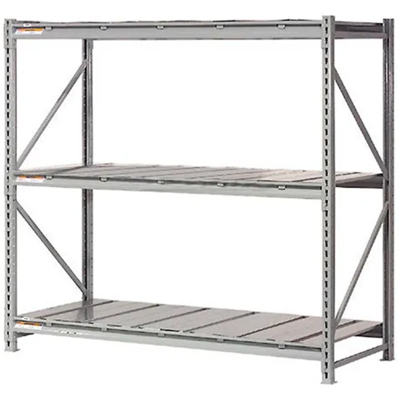 The cost-effective solution when you’re looking for heavy duty metal storage racks to handle hand-loaded materials. This Starter Unit includes 2 upright frames and 3 shelf levels with steel deck. 5/8″ thick rib-formed steel deck features a galvanized finish. These bulk storage racks offer almost twice the capacity per level as standard bulk racks thanks to the formed step beam frame. Beams attach to frame in seconds without tools. The 14-gauge upright steel frame measure 1-3/4″ x 1-3/4″ and allows beam adjustment easily on 2″ centers. Heavy-duty 12-gauge beams have 3 hooks at each end for positive connection. Also available with wire or wood deck, or rack unit alone (supply your own deck).