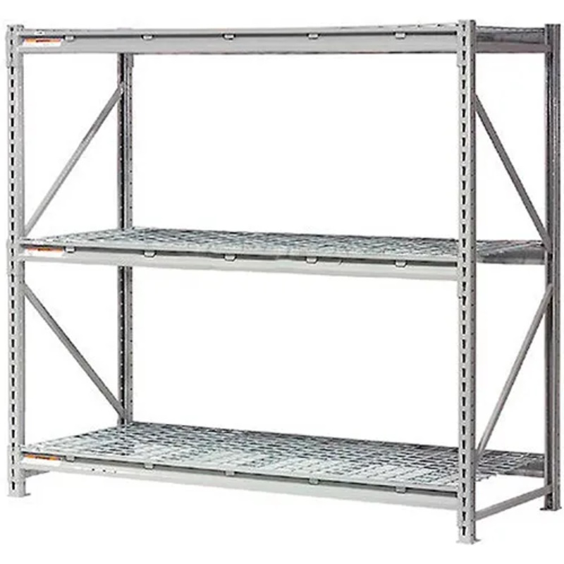 The cost-effective solution when you’re looking for heavy duty metal storage racks to handle hand-loaded materials. This Starter Unit includes 2 upright frames, 3 shelf levels with wire deck and 5 deck supports per level. These bulk storage racks offer almost twice the capacity per level as standard bulk racks thanks to the formed step beam frame. Beams attach to frame in seconds without tools. The 14-gauge upright steel frame measure 1-3/4″ x 1-3/4″ and allows beam adjustment easily on 2″ centers. Heavy-duty 12-gauge beams have 3 hooks at each end for positive connection. Also available with wood or steel deck, or rack unit alone (supply your own deck).