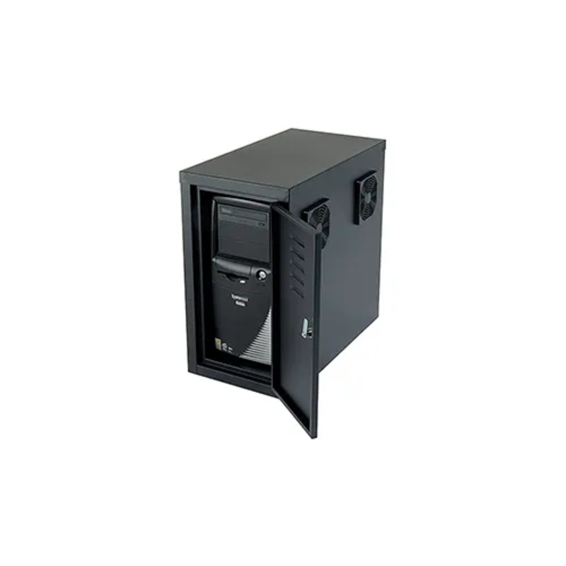 Protect valuable CPU towers and restrict access to unwanted personnel for safety using this CPU security cabinet. This side cabinet holds CPU towers safely and securely. Made of heavy duty steel with a powder coat finish. Front and rear cabinet doors feature louvers for ventilation and cylinder locks for security; includes 2 keys, locks keyed alike. Built-in cable management openings throughout. This lockable CPU holder includes 2 Exhaust Fans to help reduce heat build up and maintain CPU cooling. CPU cabinet measures 12″W x 22-1/2″D x 21-1/2″H overall. Cabinet interior dimensions 8-1/2″W x 20-7/8″D x 18-1/8″H. CPU storage cabinets can be attached easily using 4 screws. Compatible with the Orbit 81″ post.
