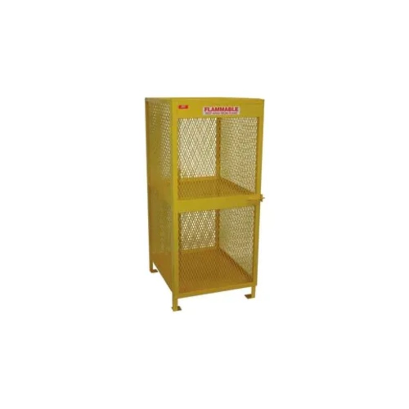 This painted cylinder storage cabinet consists of a 14-gauge roof, 13-gauge expanded metal body, angle iron framing and all-welded construction for maximum strength and rigidity to protect your cylinders from unauthorized handling. Ruggedly built cabinets provide efficient, compact storage for indoors. Heavy-duty construction, highly visible Flammables warning sign and a padlock hasp (lock not included) for security. Exceeds OSHA 1910.110 requirements and NFPA standard #58-79. Two 14 gauge shelves. Yellow powder coat finish. Shipped assembled, ready to use. Includes smooth 1″ tubular support rails for cylinder protection. 1 Year Limited Warranty.