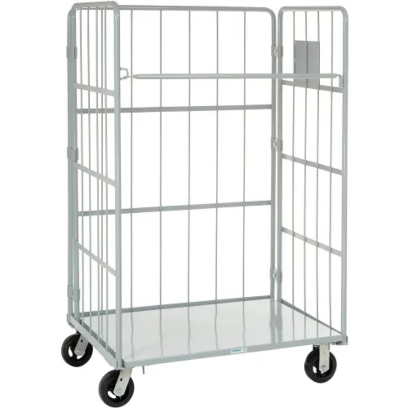 Strong 16 gauge tubular steel frame folds and nests for space saving storage. 42″ x 30″ bottom shelf folds up and right side folds in forming an “L” shape for easy, compact storage. 6″ x 2″ mold-on rubber casters, 2 swivel, 2 rigid. Durable gray enamel finish. 43″L x 32″W x 67″H overall. Easy assembly.