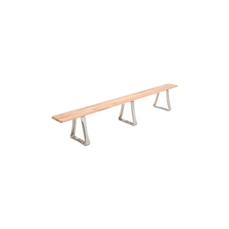 Locker Bench Hardwood Top w/Stainless Steel Trapezoid Pedestals, Bolt Down Style, 108"W x 9-1/2"D x 17"H Extra convenience in the locker room. 1-1/4" thick hardwood bench features a heavily varnished top and sturdy stainless steel base. Trapezoid stainless