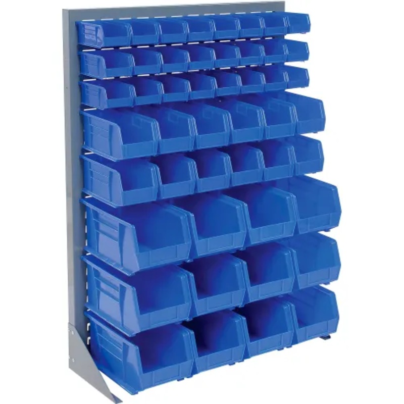 Singled Sided Louvered Bin Rack 35"W x 15"D x 50"H with 42 of Blue Premium Stacking BinsOrganize, transport and store parts, components and hardware withmaximum efficiency. Heavy-duty 16-gauge steel louvered bin rack provideseasy removal of polypropylene b