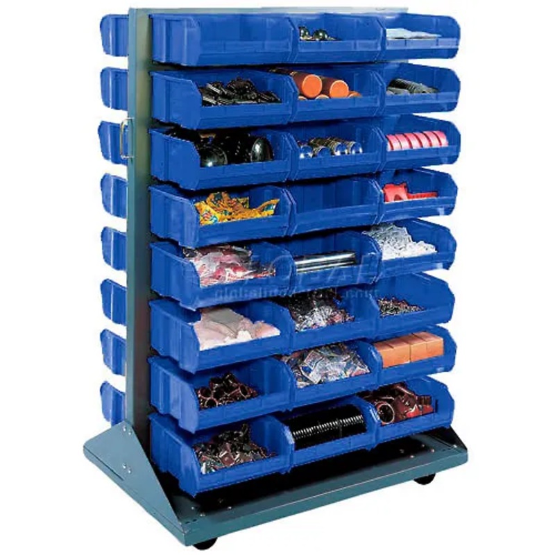 Global Industrial Mobile Double Sided Floor Rack – 24 Blue Stacking Bins 36 x 54