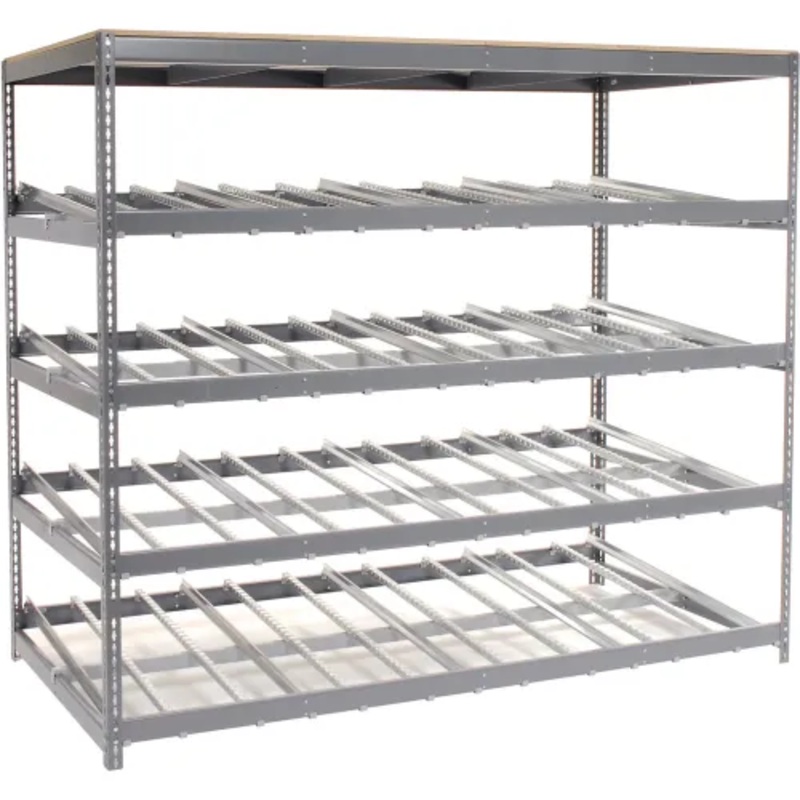 Helps make inventory control more efficient. Unique “flow” design uses gravity to slide cartons to front for easy access. Loads from the back to ensure that first inventory in is the first inventory out. Cartons are transported on roller tracks constructed of U-shaped galvanized steel channels with plastic wheels that support 50 lbs./ft. Box guide rails can be adjusted horizontally and beams can be adjusted vertically to accommodate varying carton sizes. Storage shelf levels are adjustable on 1.5″ centers for height flexibility. Box guide rails are used between each pair of roller tracks. Additional roller tracks can be added depending upon carton sizes. Each gravity flow storage level includes four pair of roller tracks with five box guide rails and one cross support. Racks include 5/8″ thick particle board top storage level that supports up to 1000 lbs. Gray baked enamel finish. Easy assembly.