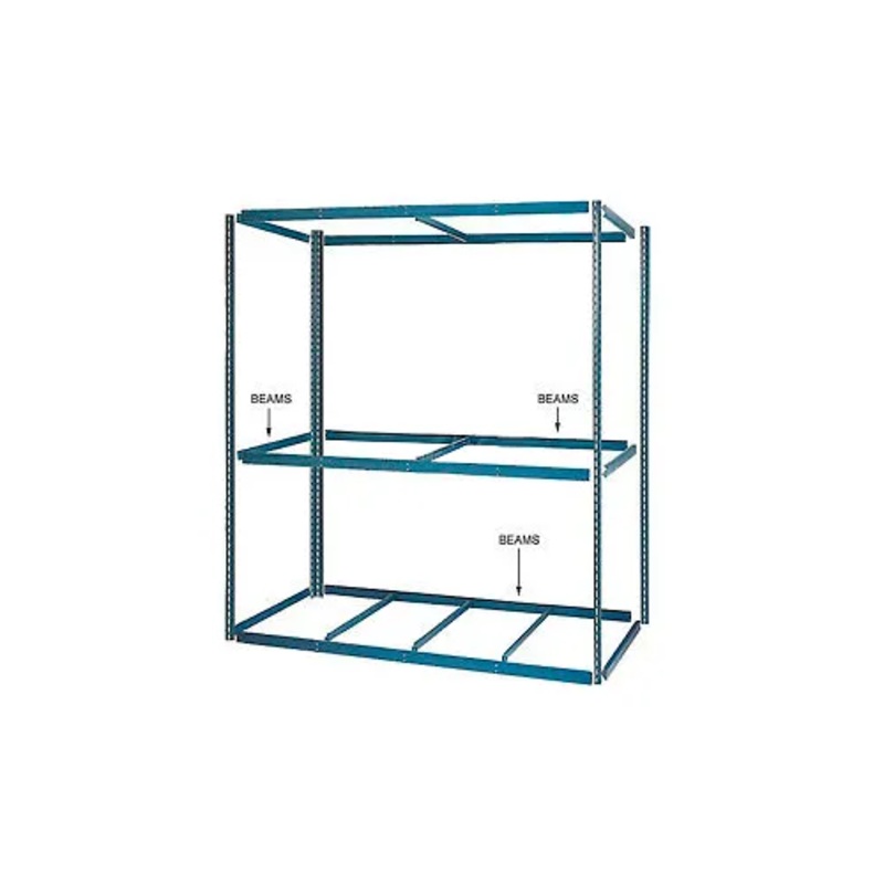 Each Level Requires four beams. Use Double Rivet Beams on top and bottom levels of all units. Use Single Rivet Beams on all intermediate levels, or increase capacity by using Double Rivet Beams on all levels. Beams can be used as ledges at any required height to prevent merchandise from falling or rolling off shelves.