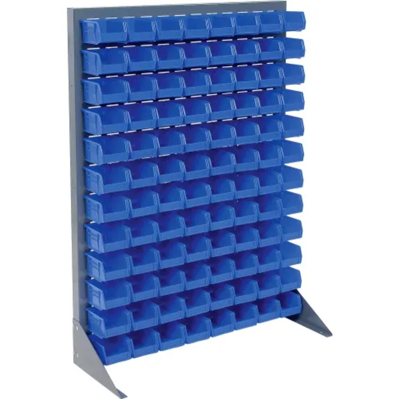 Singled Sided Louvered Bin Rack 35"W x 15"D x 50"H with 96 of Blue Premium Stacking BinsOrganize, transport and store parts, components and hardware withmaximum efficiency. Heavy-duty 16-gauge steel louvered bin rack provideseasy removal of polypropylene b