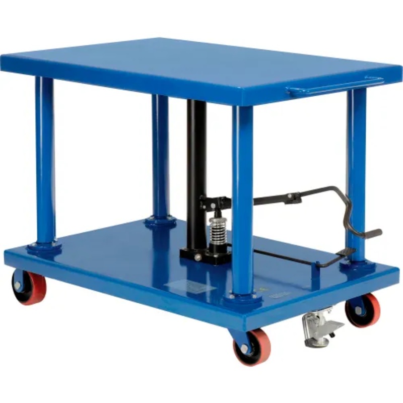 Use at conveyor or production lines, as an adjustable workbench or positioning table, or at the dock loading and unloading trucks. Solid steel platform and base with durable enamel finish, and central lift point offer sure, stable lifting. Foot pedal operated durable hydraulic jack offers 1/8″ of lift per stroke. Safety floor lock holds table in position. Easy rolling, 2 swivel 2 rigid polyurethane wheel casters. 1 Year Limited Warranty.