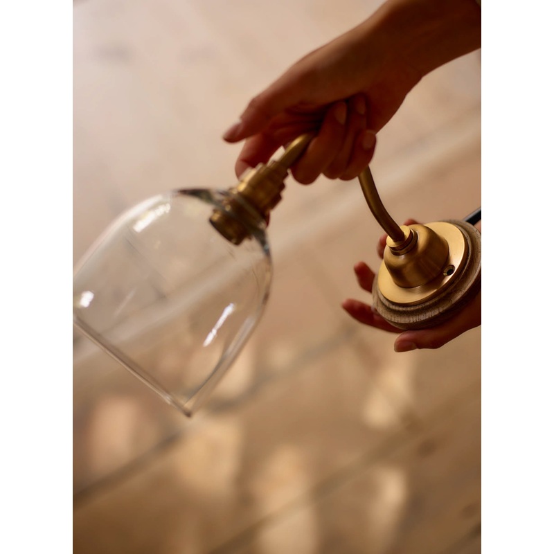- An elegant domed glass wall light with bell-like contours - Crafted from brass with an antiqued finish- Subtle ripples in the glass and a rolled edge celebrate the hand-blowing process- A beautiful marriage of classic materials: aged oak, antiqued brass