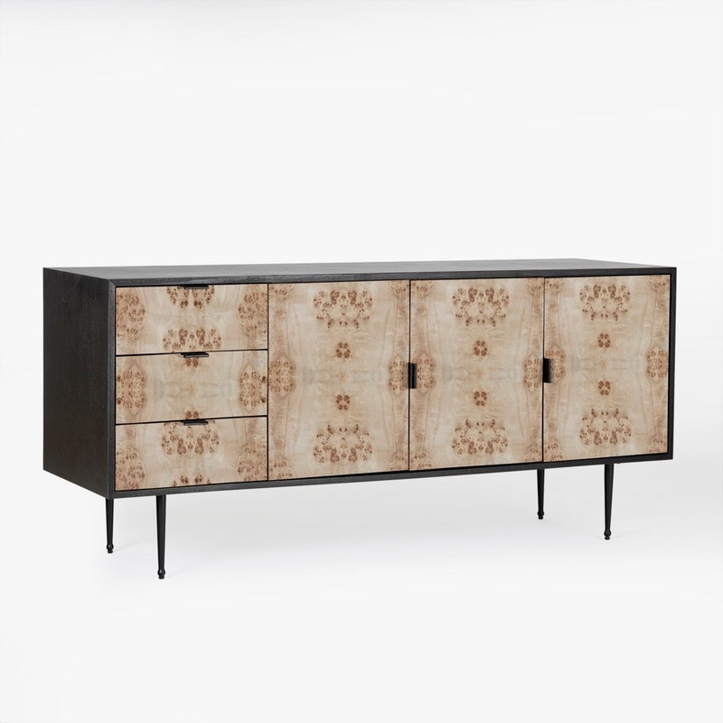 Discover the timeless charm of the Gregory Buffet. This modern masterpiece features a Burl veneer cabinet with the option of a light or dark burl, artfully paired with a solid wood black outer case. The inclusion of cast iron legs and drawer pulls adds an industrial touch, creating a statement piece that seamlessly blends sophistication with functionality.