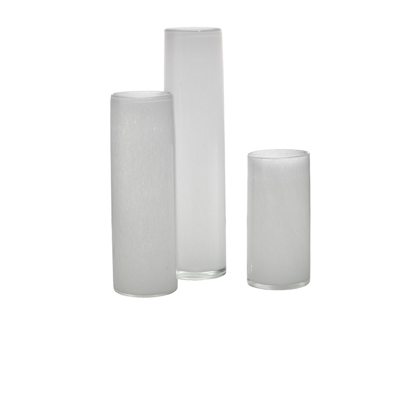 This art glass collection includes three smooth cylinder vases in subdued colors that distinguish them from the typical vase. Each is blown by hand, endowing them with soft striations and bubbles, irregularities that enhance their simple form. When placed