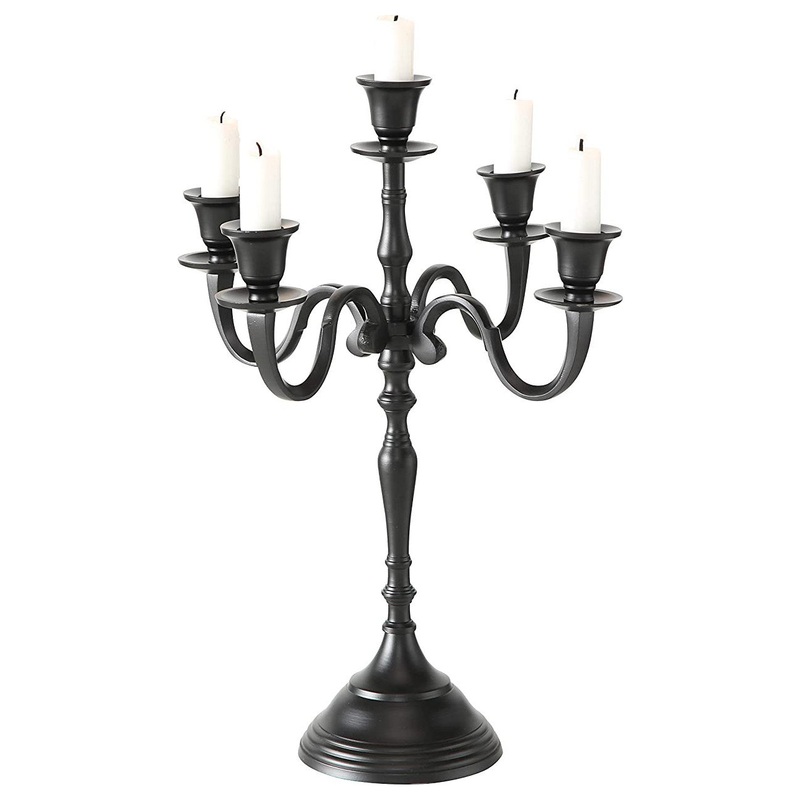 Add sophisticated style and party panache to your table with our stunning black 5 Candle Candelabra. With 4 arms, extend the wonderful glow of a lighted candles to welcome your guests. Over 1 Foot Tall. Well sized, this piece measures as follows: 11.75 diameter x 15.75 inches tall. Elevated, let this candelabra create an inspired atmosphere of welcoming warmth on your table top. Made to hold 5 taper candles that stretch out on extended arms decorated with curved lines, with a clever bobeche (or drip catcher plate) under each holder. Each candle holder is designed to hold a standard size taper candle. High quality craftsmanship. Loaded with ambiance, this candelabra is hand crafted from aluminum nickel, carefully polished, and finished in black. Each piece of the candelabra can be screwed apart for easy cleaning. There are remains of the artisans touch in the minor surface imperfections that are completely normal and to be expected. Delight your guests when you add lighted candles to make any occasion feel magical. Enjoy! By Whole House Worlds Welcome to the product line of Whole House Worlds. The New York based company offers high quality, stylish products for every room in the house, and beyond. From the kitchen, to the living room, to the bedroom, dining room, home office, closet and garden: Our criteria are comfort, quality, style and value.