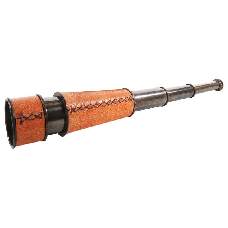 This hand held telescope is made of high quality brass. Each component is crafted with the finest craftsmanship. It comes with antique looking leather overlay that provides a rugged look and feel. Its available in antique brass finish and comes with a rose