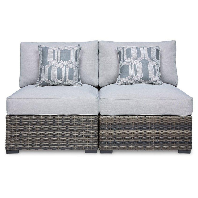This cool, casual outdoor chair will raise the comfort level and visual appeal of your outdoor living space. Made of handwoven wicker in neutral tones of light and dark gray, the armless chair blends beautifully into your lanai or pool and patio area with thick, comfy cushions wrapped in Nuvella high performance fabric that is stain resistant, fade resistant and easy to clean. This cushioned armless chair can be used on its own or paired with other pieces of the matching sectional to create a space that holds up to Mother Nature and ages gracefully for years of enjoyment.