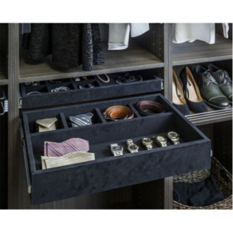 Features: The organizer includes 100 pound rated full extension slides with push to open functionality Designed for installation in 14" deep closet organizers Consists of 5 felt lined compartments to keep your jewelry organized and safe Constructed of plyw