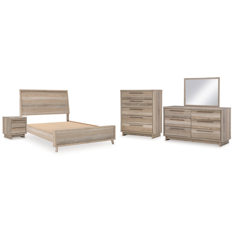Hasbrick Queen Panel Bed with Mirrored Dresser, Chest and Nightstand