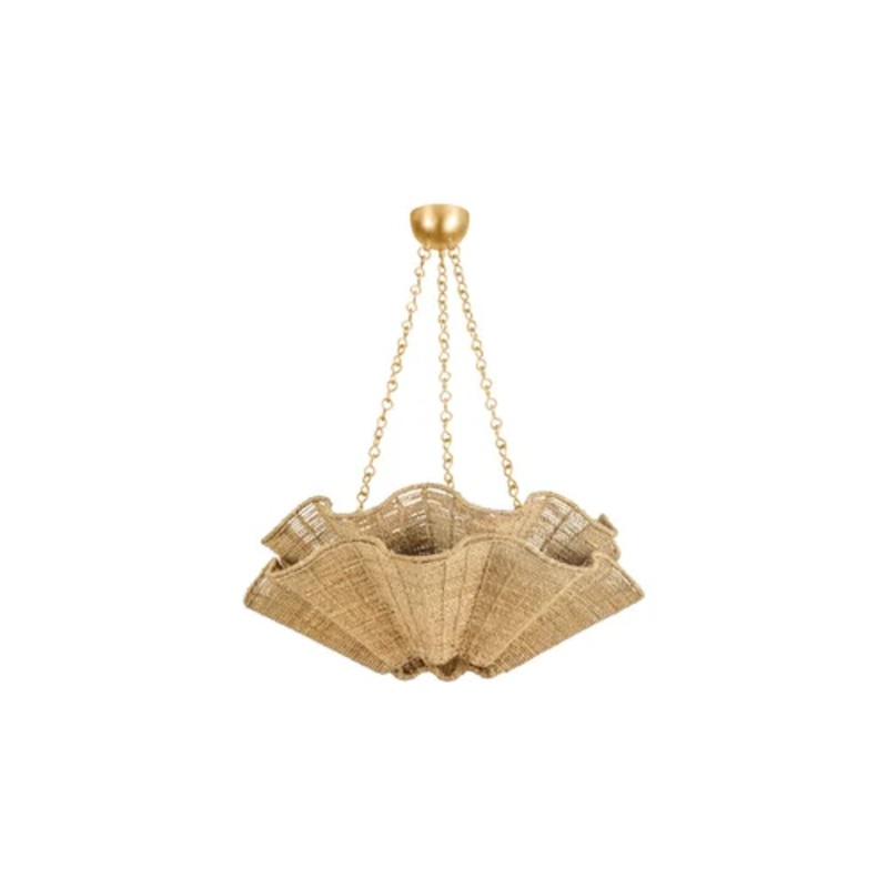 It typically hangs above dining tables, entryways, or living room seating areas, where it draws the eye upward and softly lights the room. Its shade is made from handwoven abaca, a natural fiber known for its subtle texture and earthy warmth. The soft, organic weave contrasts beautifully with the chandelier’s metal structure, finished in a rich vintage gold leaf. This combination gives the Hayworth a graceful balancenatural yet refined, elegant without being loud.