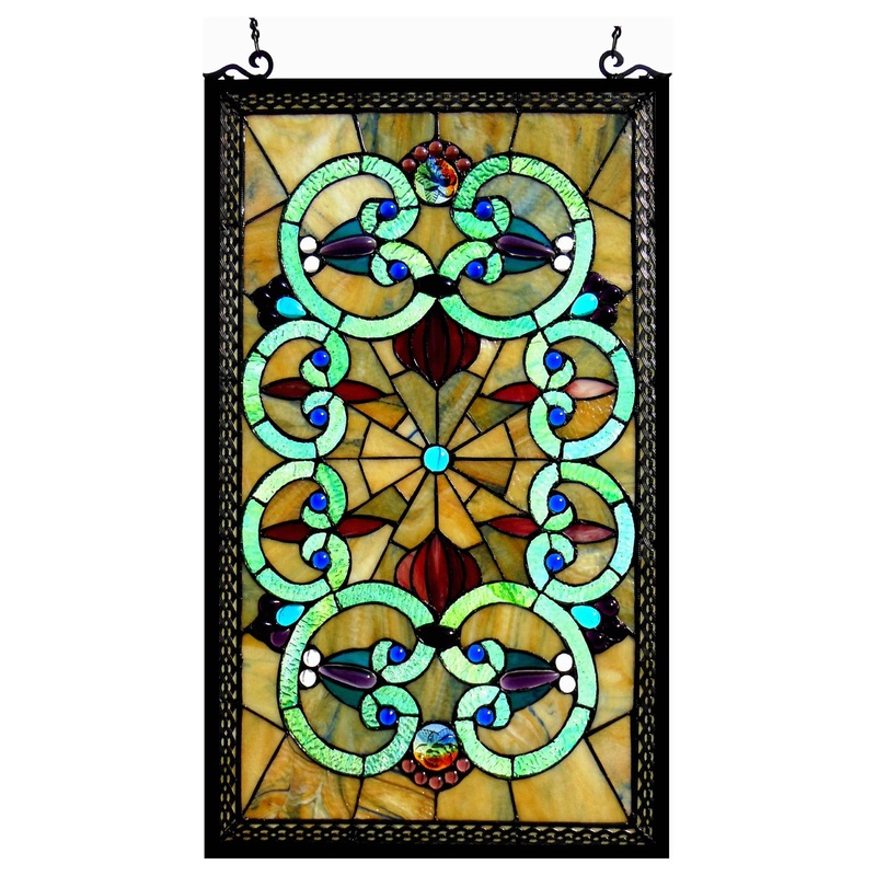 This hand crafted Tiffany-style, Victorian design round widow panel will brighten up any room. The beautiful blue, green, red and amber art glass will add warmth and beauty to any setting. Made from individually hand cut of 310 pieces copper-Foiled stained glass and 55 beads. Includes attached hooks and 27.5 inches of chain for easy installation.