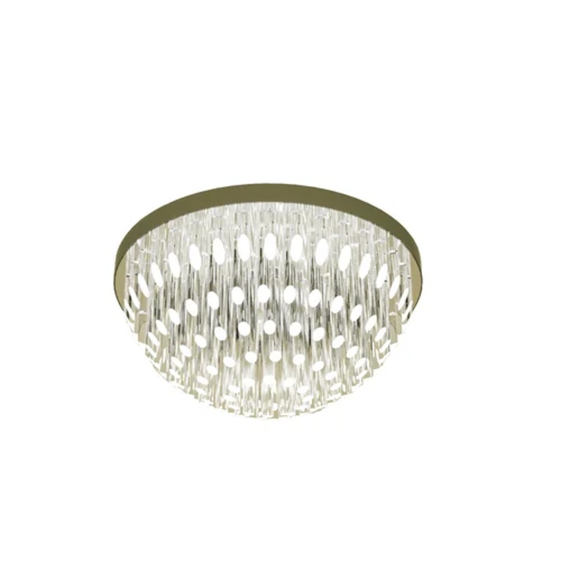 The majestic Helios crystal chandelier has been transformed into a ceiling lamp, becoming a luminous half-sphere. Its 120 Japanese acrylic stems with internal LED and the mirror chrome details give the whole an elegant, yet bold appearance. Moreover, a delicate backlight has been introduced to remove the shadows of the single elements reflected into the ceiling, creating a unique luminous halo.