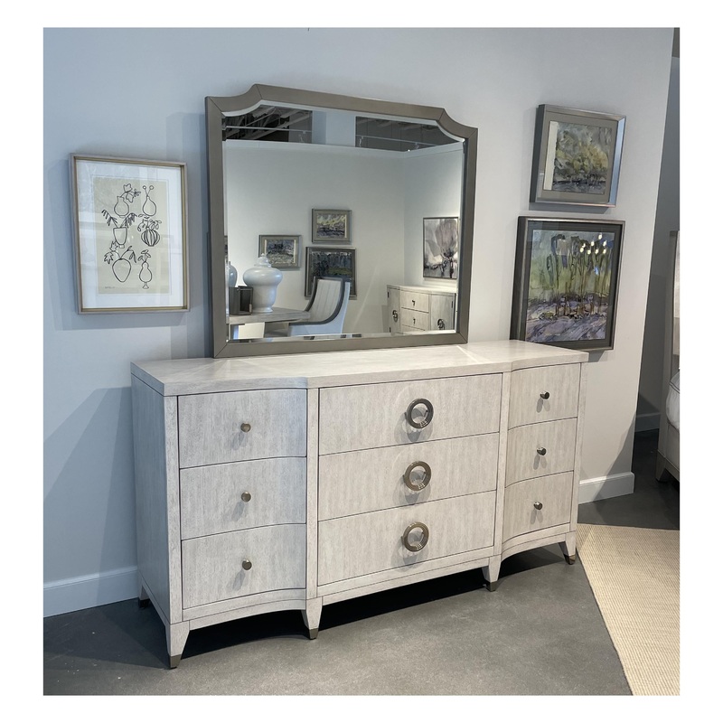 Details:Framed, beveled-edge mirrorAttaches to dresser with included bolts and two upright support rails