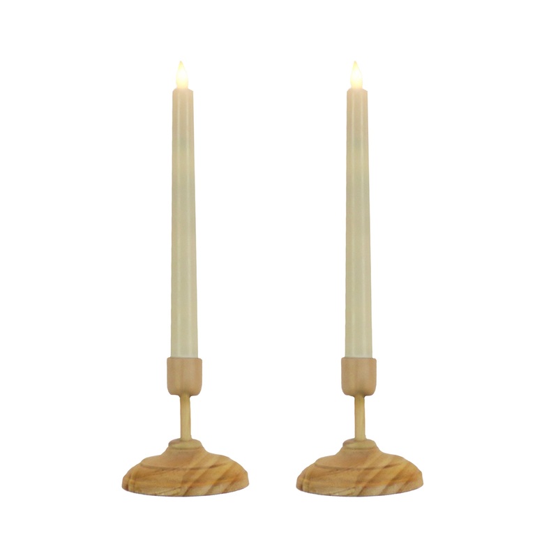 Battery operated with remote controlled functions, these two flameless candles produce a realistic, soft, and safe candle glow. The smooth, ivory color candle surfaces are crafted with real wax, and each is seated in a decorative long stem candleholder constructed of wood with a natural finish. A handheld remote control operates the lifelike candle flame with functions that include brightness, flicker speed, and timer settings. Set uses a total of four AAA size batteries (not included).
