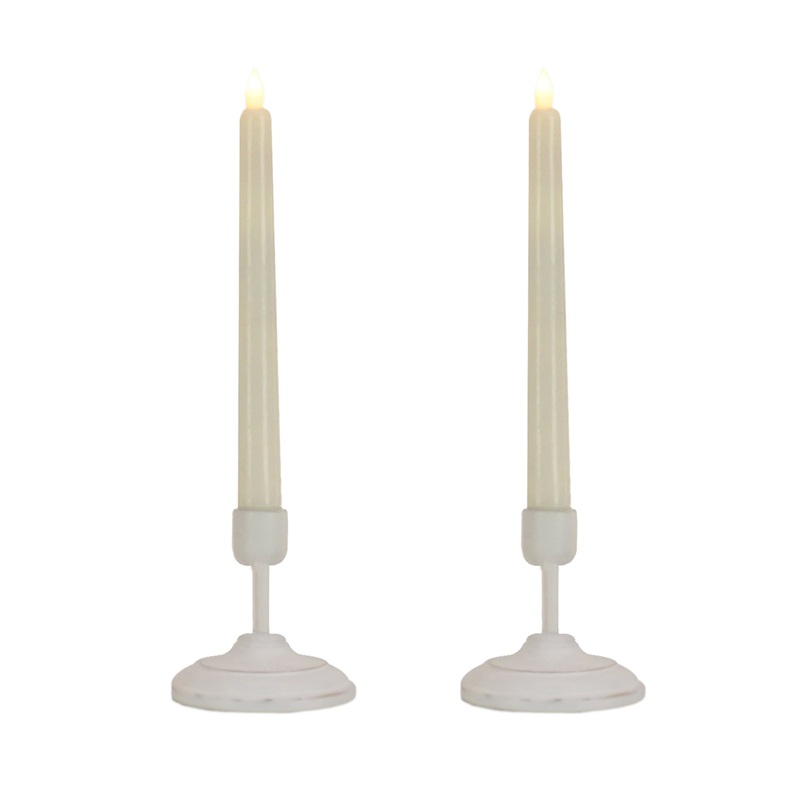 Battery operated with remote controlled functions, these two flameless candles produce a realistic, soft, and safe candle glow. The smooth, ivory color candle surfaces are crafted with real wax, and each is seated in a decorative long stem candleholder constructed of wood with a whitewashed finish. A handheld remote control operates the lifelike candle flame with functions that include brightness, flicker speed, and timer settings. Set uses a total of four AAA size batteries (not included).