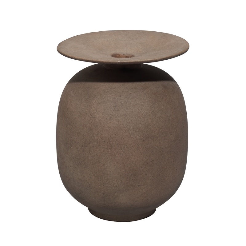 The finish is raw, gently antiqued to mirror the look of a vintage find. The shape is softly rounded, with a narrow neck that flares into an oversized lip. The look is perfection, and easily integrated into nearly any decor style.