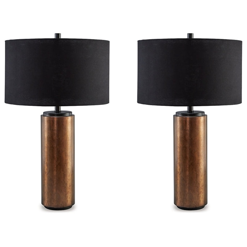 Leaning toward a unique contemporary look? This fashion-forward table lamp set is pure delight. Its smooth cylindrical shape and antiqued brass-tone finish create a bold aesthetic. An instant focal point, designers love the soft light diffused by its elega
