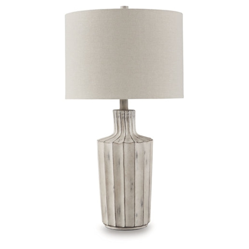 Exuding a casually cool sensibility, this table lamp is a bright idea whether its in a living space, bedroom or entry. The shapely base sports a vertical line pattern with a distressed finish that enhances its relaxed appeal.Made of polyresin with drum har