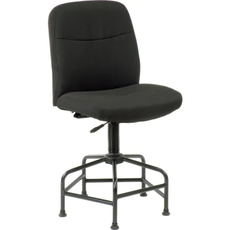 Accommodates the needs of big and tall people. Sturdy, reinforced construction for durability. Ultra 5″ thick cushioning covered in black acrylic fabric for extra comfort. Roomy 20″D x 23″W swivel seat, 21-1/2″W x 23″H back. Pneumatic 26″ to 29″ height adjustment. Four footrest heights for customized leg support. Durable Spider base with glides. Optional arms adjust up/down, in/out. Brand is Interion By Global Industrial