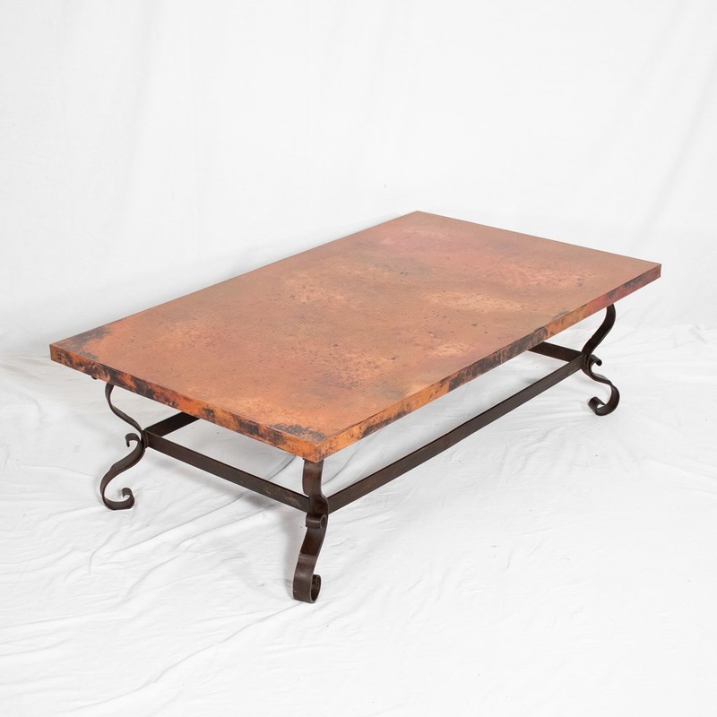 Generous proportionsof copper are paired with scrollsof ironto complete the gorgeous Ironton coffee table. Earthy tones of our Natural w/ Spots copper and Antique Rusted iron finishesare juxtaposedfor a classic southwest vibe. If the proportions are too bi