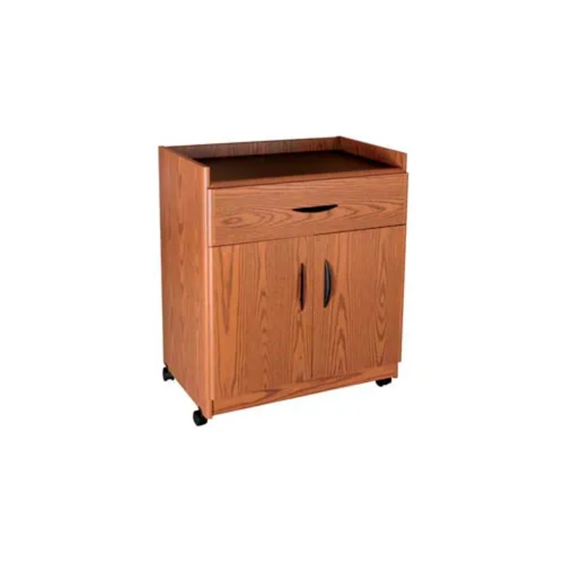 Deluxe Machine Stand - 30"W x 19-5/8"D x 36-1/8"H Medium Oak Made of scratch and stain resistant, thermally fused laminate wood for long lasting durability. Store coffee supplies and accessories or as printer or fax machine stand. Recessed black thermally