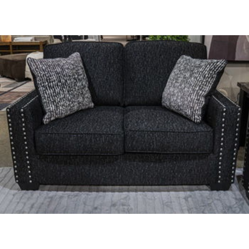 This stunning loveseat leaves a lasting impression. Its cozy cushions, chic coal-colored upholstery and striking nailhead trim are a perfect blend of comfort and contemporary design. And heres the showstopperambient red, white and blue LED lighting along the loveseat’s base. The look is simply wow.