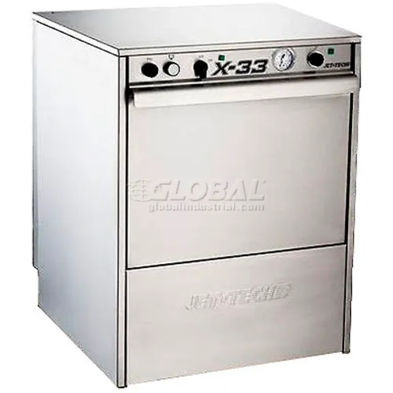 Jet-Tech X-33, Undercounter Low Temp Dishwasher Made of all stainless steel for corrosion resistance and long lasting durability. Clean multiple racks of dishes, glasses, cups and more. Chemical sanitizing of approximately 37 racks per hour capacity. Enclo