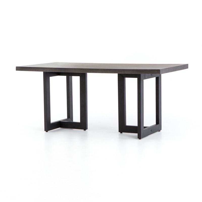 A black-finished iron base supports a rectangular tabletop of black lava stone, spurring an angular look with industrial appeal. Cover or store indoors during inclement weather and when not in use.