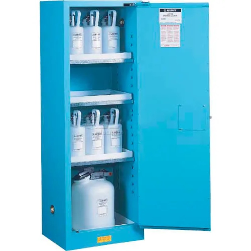 Justrite Acid Corrosive CabinetSelf Close Single Doors - 22 Gallon CapacityJustrite safety cabinet is ideal for moderate and flammable corrosives. Acid storage cabinet complies with National Fire Protection Association specifications, OSHA regulations and