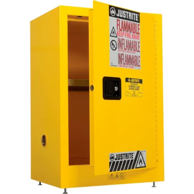 JUSTRITE FLAMMABLE CABINETSCompact Cabinet - 12 Gallon Capacity - Manual Close Single DoorThis Justrite flammable safety cabinet stores flammable liquids safely even when minimal space is available. Double walled 18-gauge all-welded steel with 1 1/2" insul