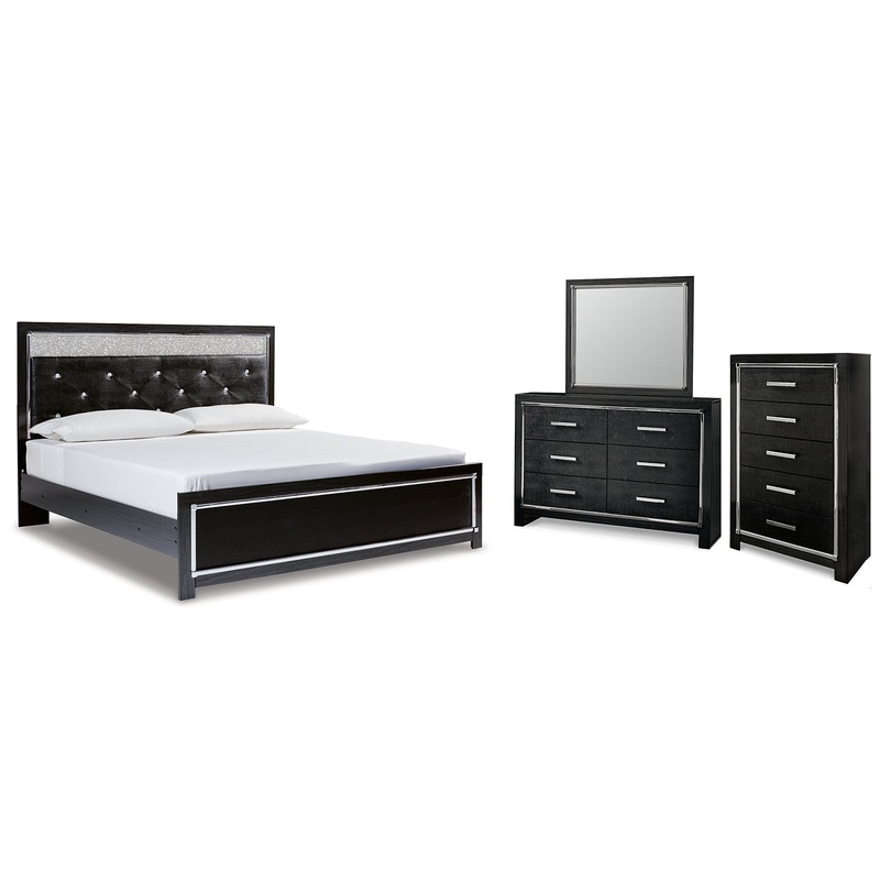 Kaydell King Upholstered Panel Platform Bed with Mirrored Dresser and Chest