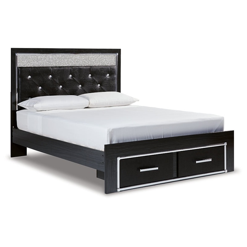 Rest easy. The luxurious look youve been dreaming of is yours for the taking, at a price sure to put you at ease. This queen upholstered panel bed with storage brings a sense of old Hollywood with a contemporary flair. A deep, dark finish, faceted chrome-tone accents and LED lighting exude Hollywood-chic style to the max. Padded windowpane stitching on the sleek, black upholstery infuses a sumptuous look thats upscale and indulgent, and utterly on trend. Double drawers at the foot of the bed provide space-saving storage.