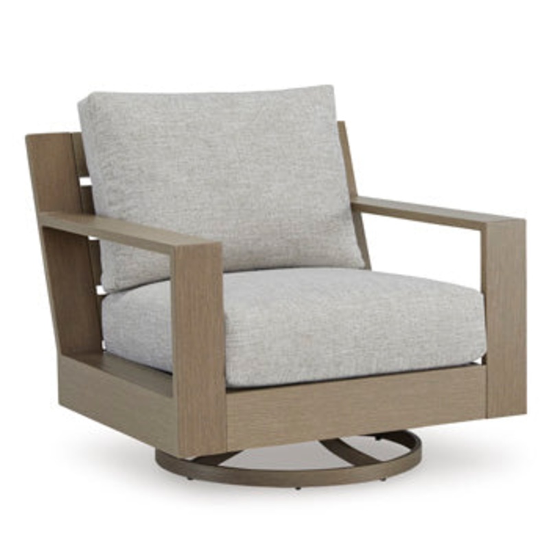 This outdoor swivel lounge chair is just what you need to get your outdoor party started. Though it looks remarkably like wood, its durable frame is perfectly suited for alfresco living. Grab a drink, kick back and swivel all around to take in the view. Wrapped in high-performance Nuvella+ fabric, the cushions are as plush as they are practical.