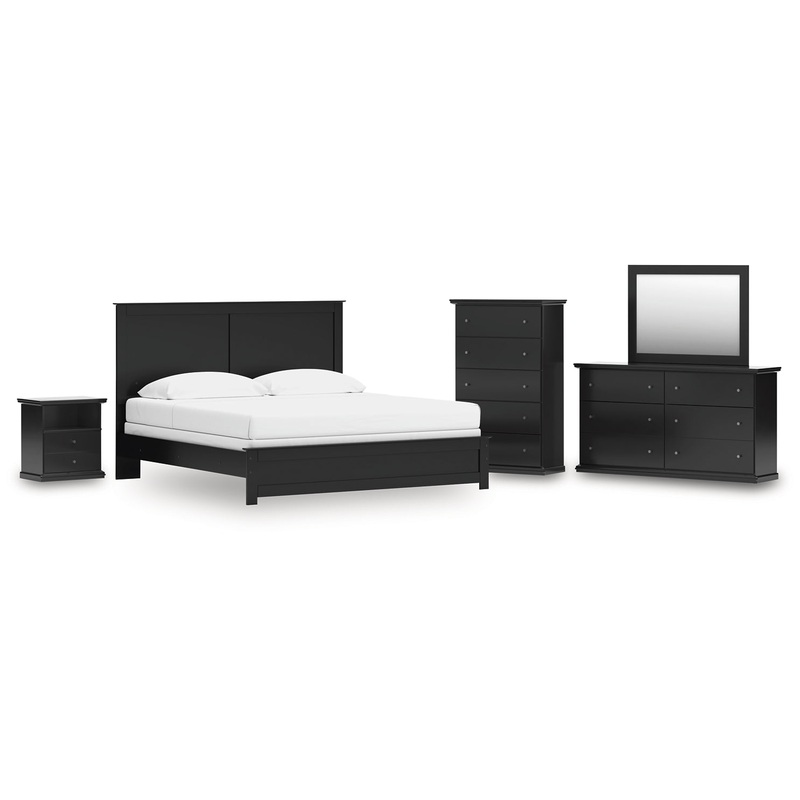 King Panel Bed with Mirrored Dresser, Chest and Nightstand