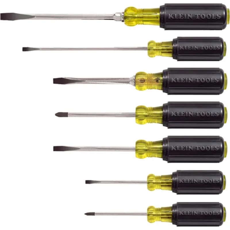 This 7-Piece Klein Toolss Screwdriver Set contains the most frequently used, general purpose screwdrivers. Included are three cabinet-tip, two Phillips-tip, and two keystone-tip style screwdrivers. Each screwdriver features Klein's patented Tip-Ident which