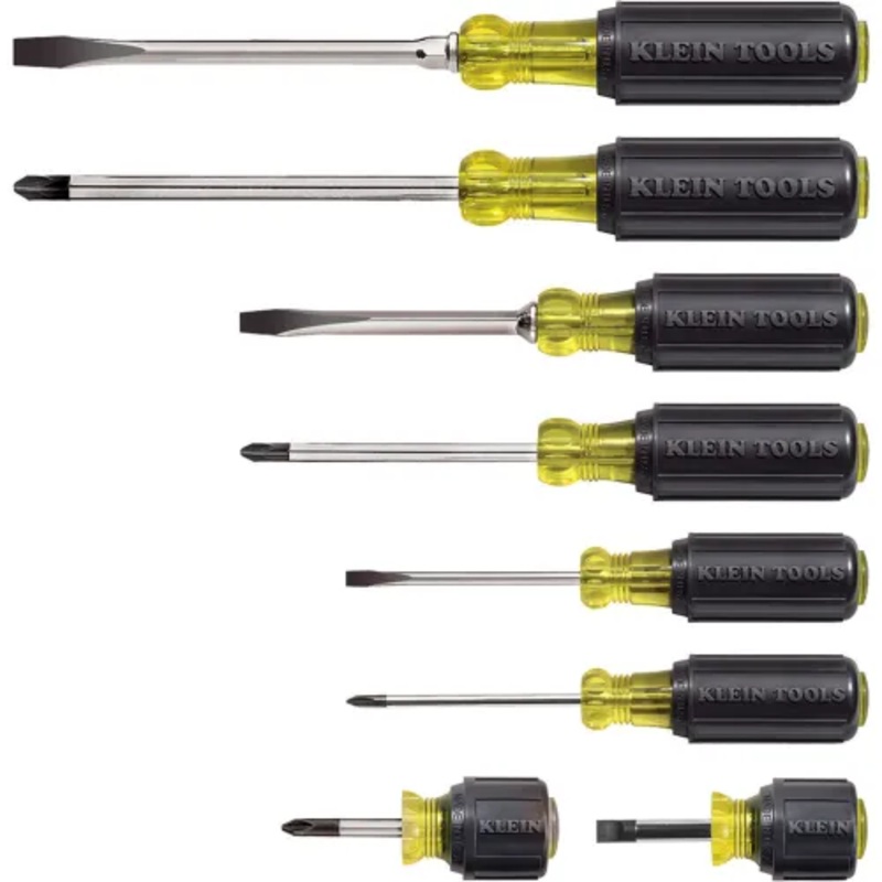 The 8 piece set features a general purpose selection of the most frequently used screwdrivers. Tip-Ident quickly identifies the screwdriver type and tip orientation. Internal flanges inside handle provide solid, twist-resistant blade anchor. The tips are precision-machined for the exact fit you expect Klein Toolss.
