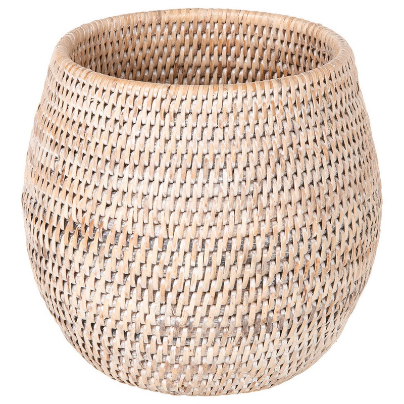 Fall in love with this small La Jolla coco rattan planter and bowl in white-wash. The rounded flair adds an unexpected beauty to this simple woven basket. Use it as a planter or as a storage basket in a multitude of ways.