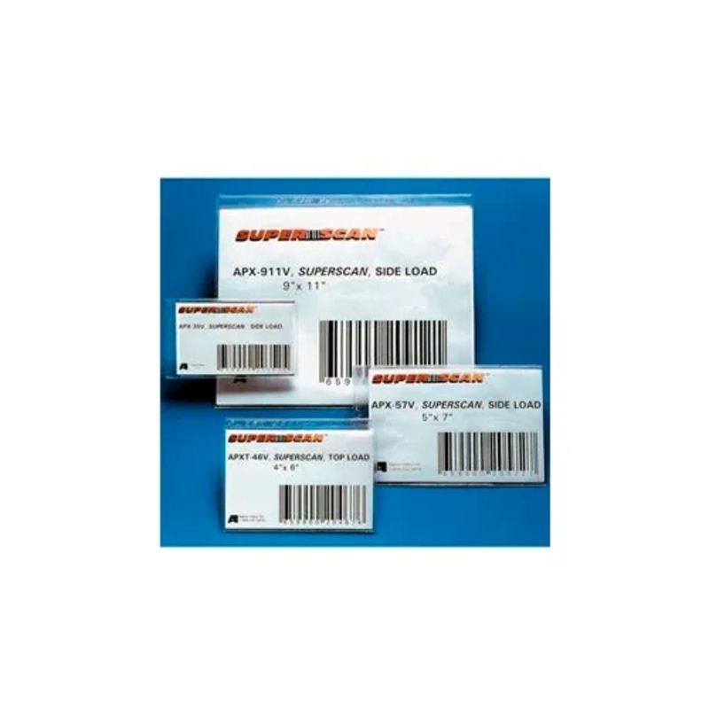 Superscan Gold, Premium Xtra Large label holders, 3" x 5", Clear, Vinyl Sleeve, side load, full self adhesive backing, ideal for pallet racking, bar code compatible finish, laser inserts included. 50 sleeves/box. 5-5/16"L x 3-11/16"H Overall Dimensions.