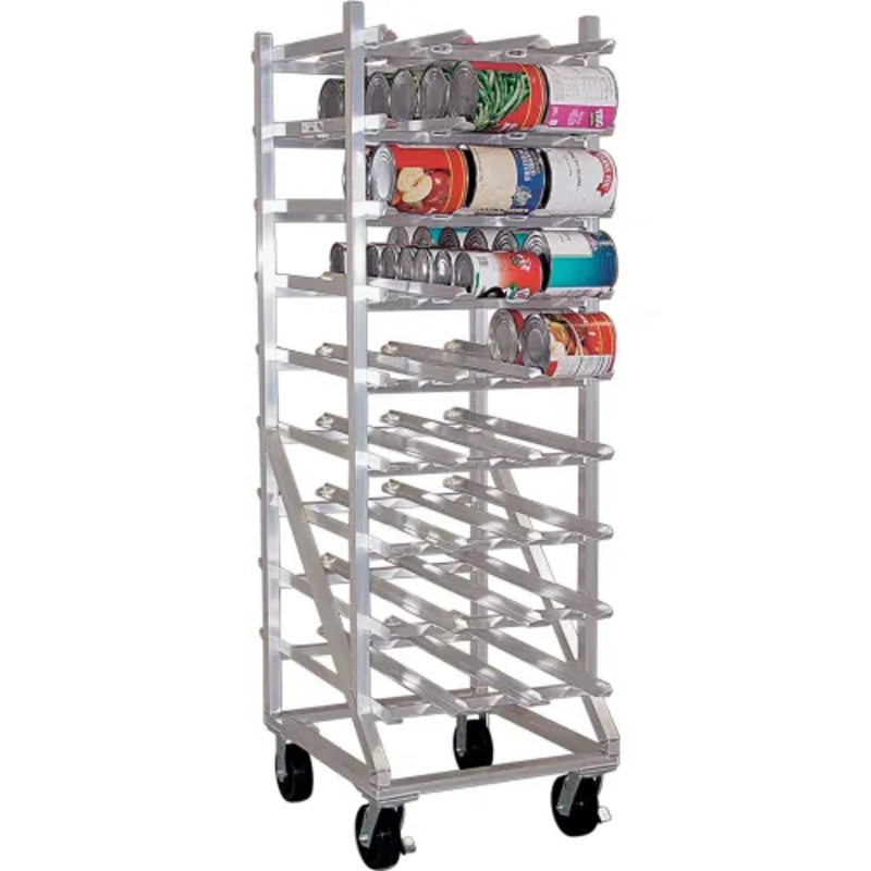 Organize your can inventory while saving valuable inventory space. Large capacity. Gravity feed system puts cans at your fingertips. Convenient one-hand dispensing from the front. Stationary unit with adjustable feet. Heavy-duty welded aluminum construction for trouble-free service. Cleaning and sanitizing is easy, just wipe down or steam clean.