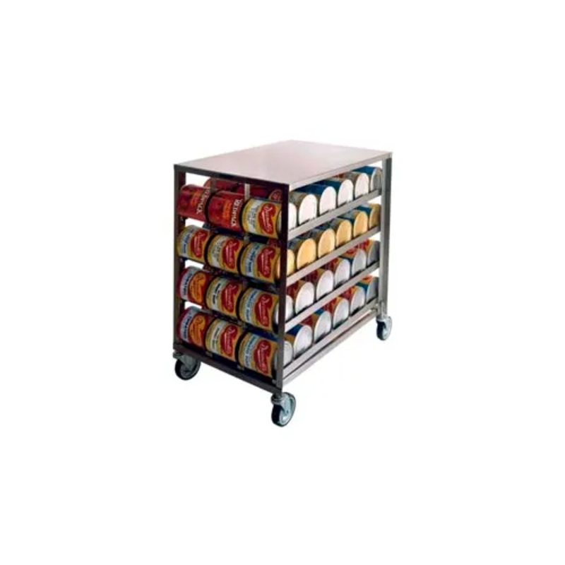 Organize your can inventory while saving valuable inventory space. Large capacity. Gravity feed system puts cans at your fingertips. Convenient one-hand dispensing from the front. Stationary unit with adjustable feet. Heavy-duty welded aluminum construction for trouble-free service. Cleaning and sanitizing is easy, just wipe down or steam clean.