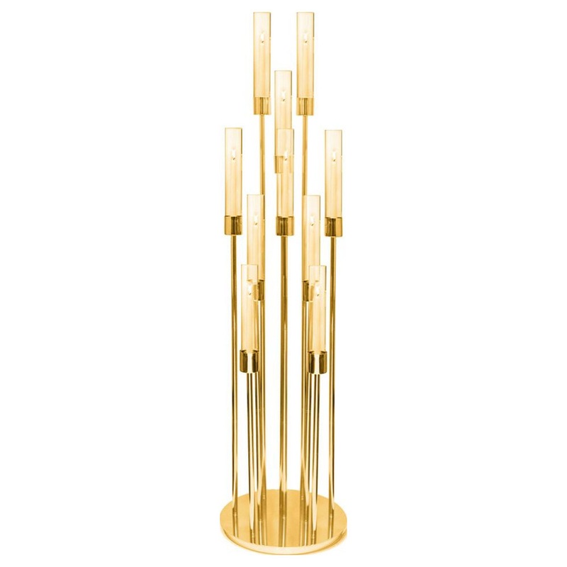 -Floor standing multi-stem candle holder -Made of metal -10 Stems Display: Height = 66" | Diameter = 16.5" -8 Stems Display: Height = 58" | Diameter = 14"Give your home a boost of luxury with our grand candle stand. Display candles in our beautiful gold or